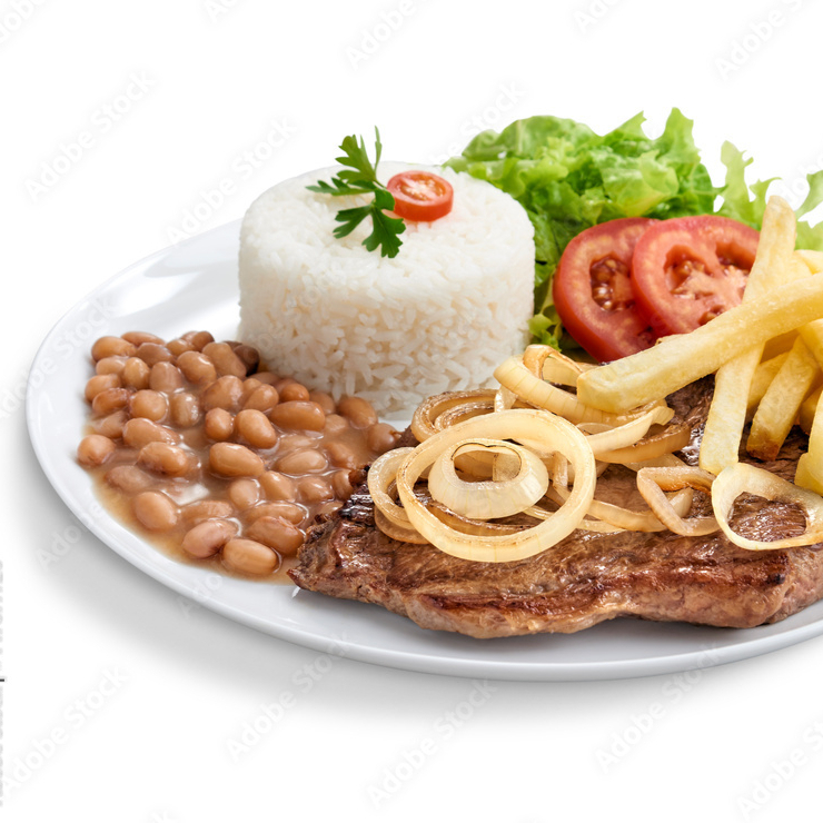 Marmita, Arroz Branco Feijão de Caldo, Bife Acebolado, Macarrão, Verdura e Salada.