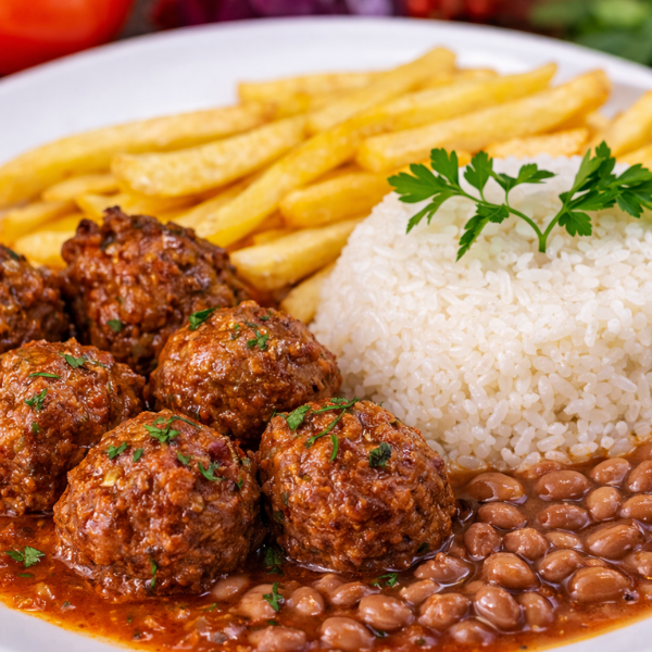Almôndegas Suculentas ao Molho Com Arroz Soltinho, Feijão de Caldo, Batata Frita Crocante e Salada. Refeição Caseira Que Dá Água na Boca!
