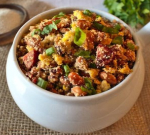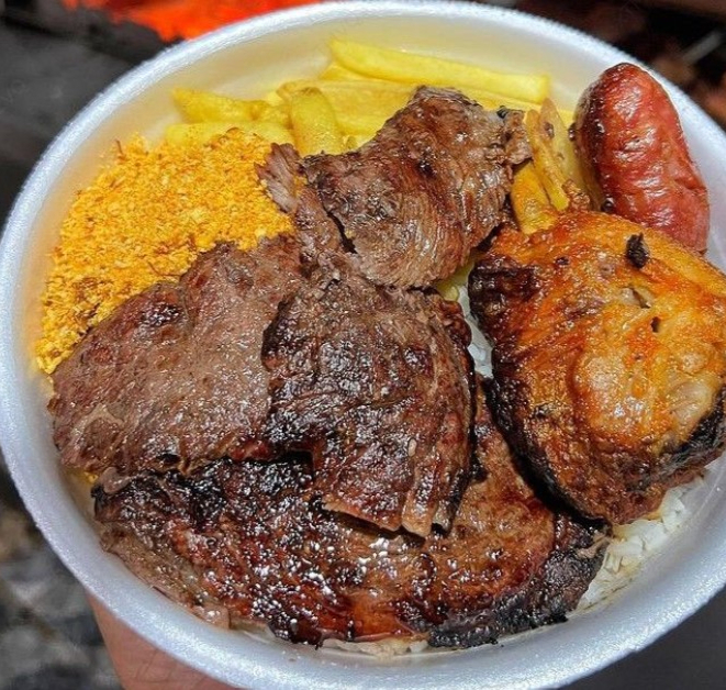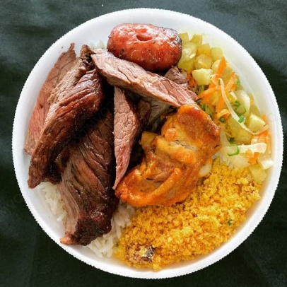 Arroz, Feijão, verduras,Farofinha,Macarrão,Frango Frito empanado e Churrasco e uma deliciosa saladinha separada .