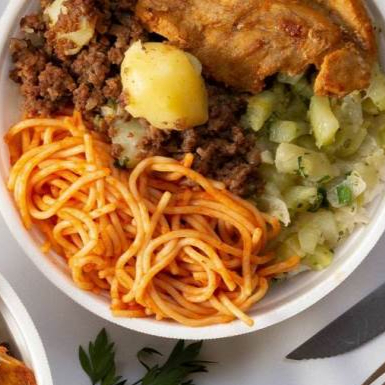 Arroz branco, feijão caldo , macarão ao molho vermelho , bife acebolado,saladas do dia ( separada