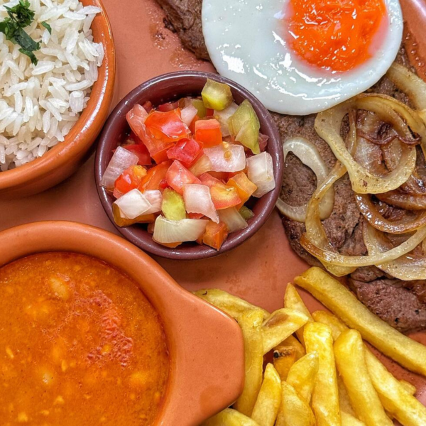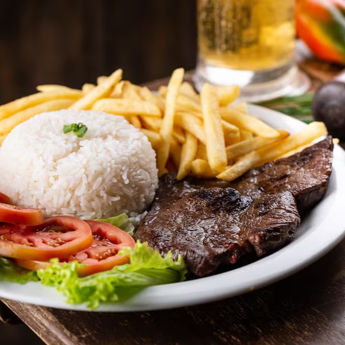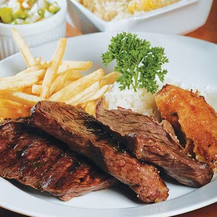 Carne de Sol na Chapa com Ovo Frito, Arroz Soltinho, Feijão de Caldo, Fritas e Salada Refrescante.