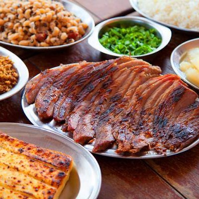 Acompanha: arroz, feijão tropeiro ou feijão verde, paçoca, vinagrete e mandioca.
