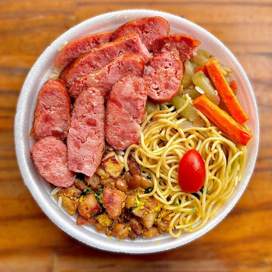 Marmita de linguiça toscana assada na brasa, servida com arroz branco soltinho, feijão tropeiro, macarrão e legumes cozidos ao vapor.