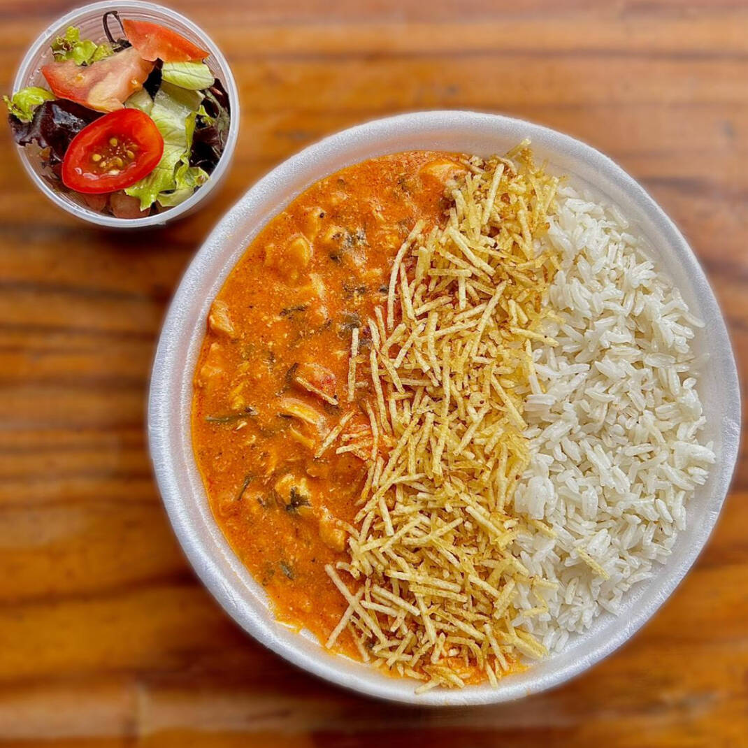 Marmita de strogonoff de frango cremoso, acompanhado de arroz branco soltinho, batata palha + saladinha fresca grátis!