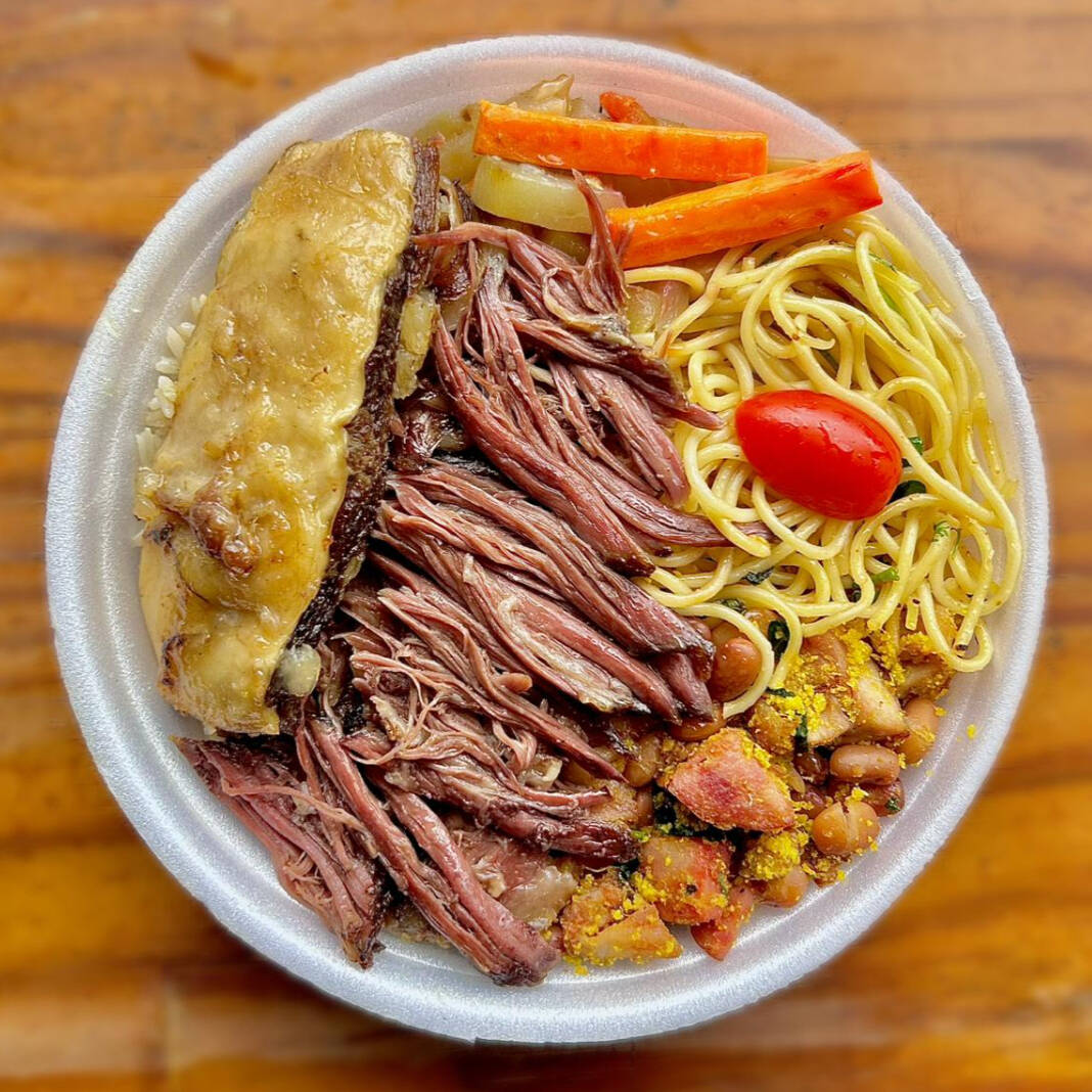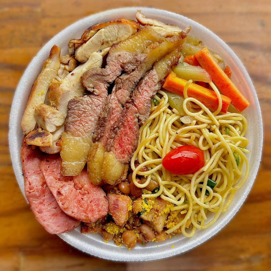 Marmita de churrasco misto (fraldinha, filé de frango e linguiça toscana assada na brasa), servida com arroz branco soltinho, feijão tropeiro, macarrão e mandioca cozida levemente amanteigada.