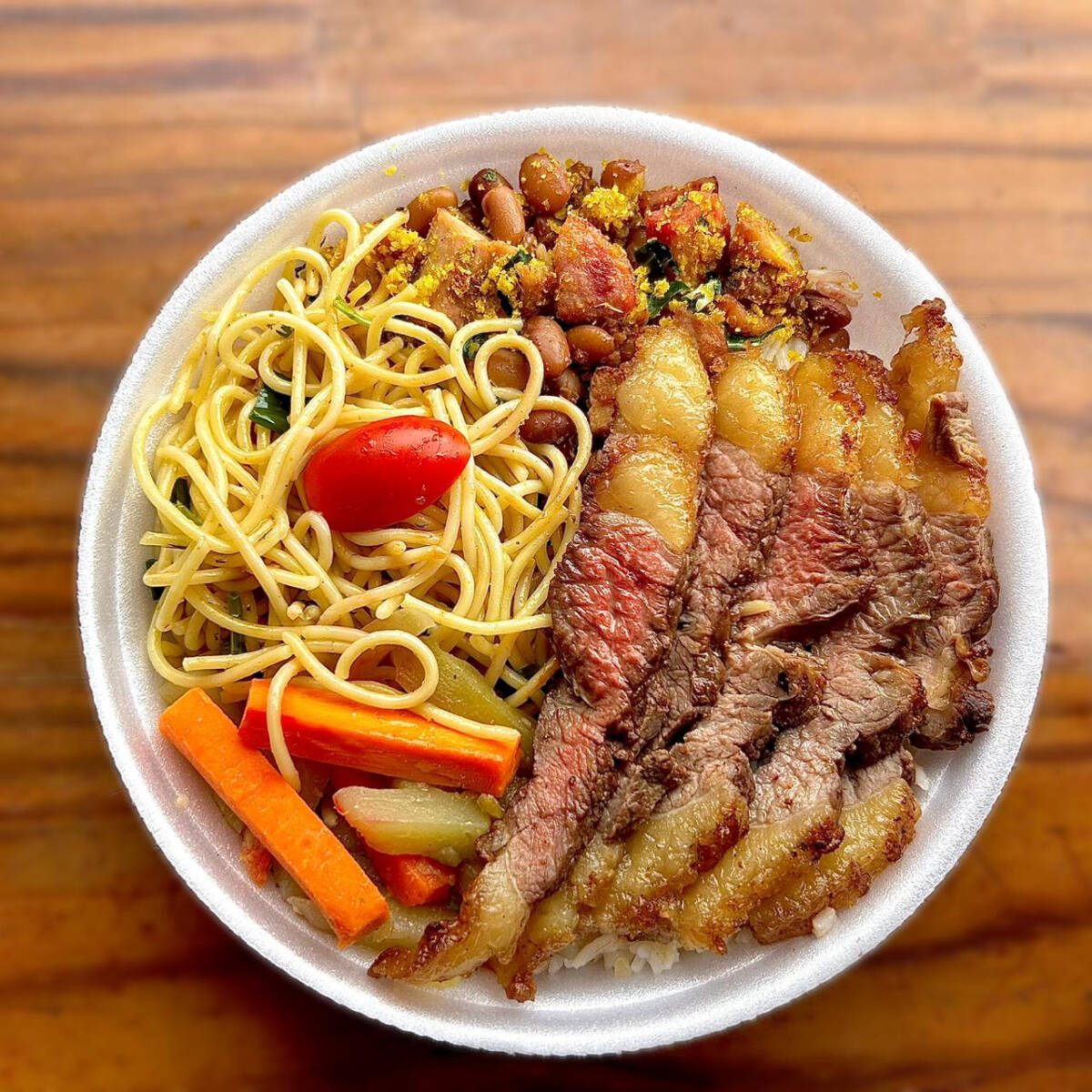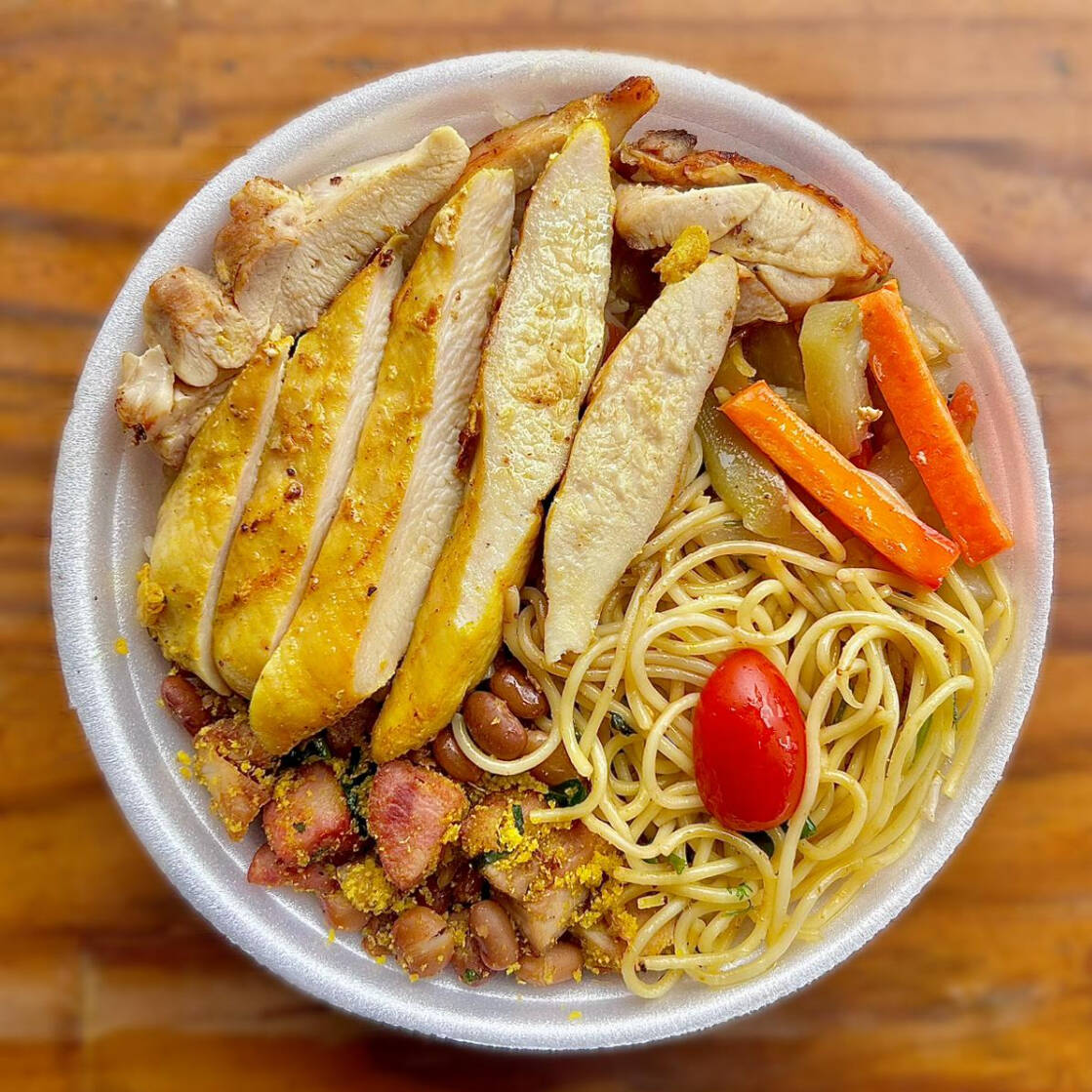 Marmita de churrasco misto (fraldinha, filé de frango e linguiça toscana assada na brasa), servida com arroz branco soltinho, feijão tropeiro, macarrão e legumes cozidos ao vapor.
