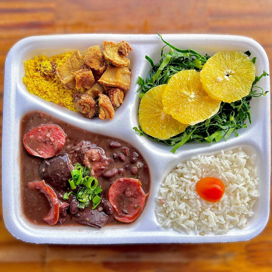 Feijoada preparado com cortes nobres defumados (lombo suíno, bacon e calabresa) preparados com tempero especial da casa, cheiro verde, cebolinha, servidos com arroz branco soltinho, couve fresca, laranja, farofa caseira e torresmo.