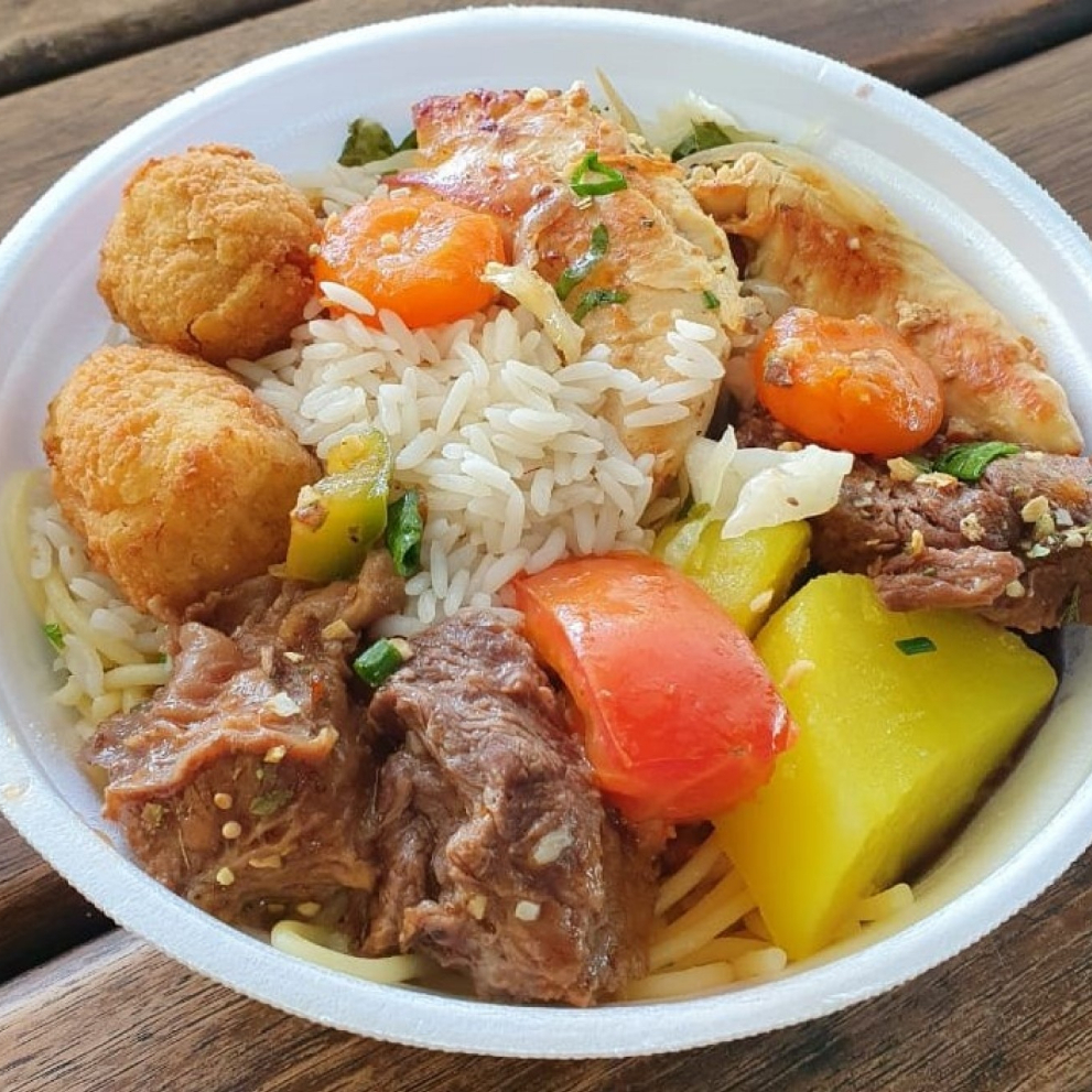 Marmitex Economica Arroz Misto Com Carne Seca E Churrasco
