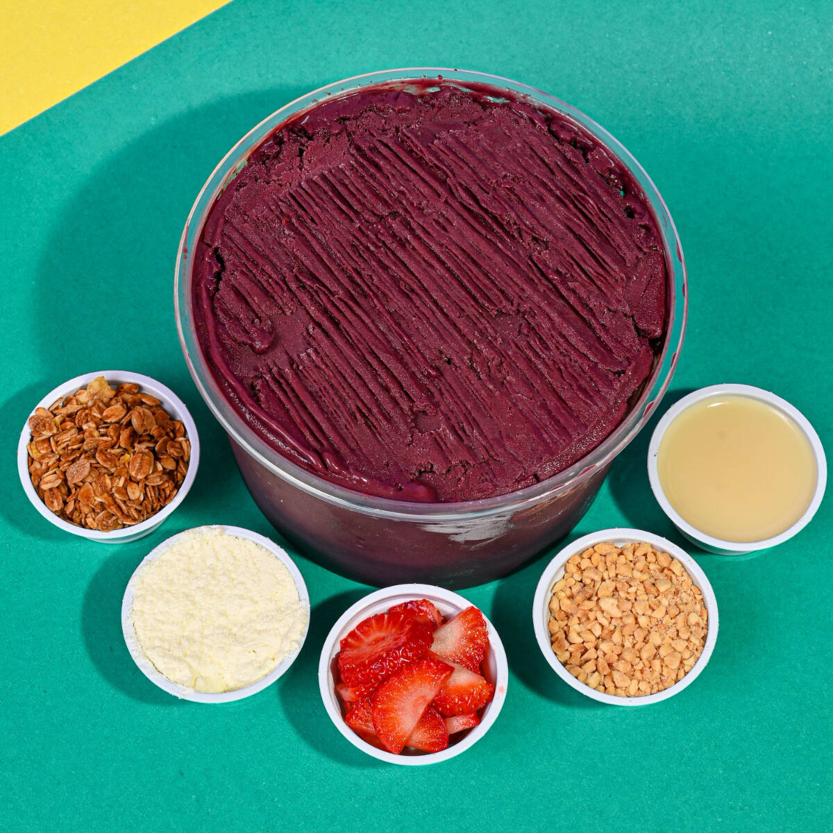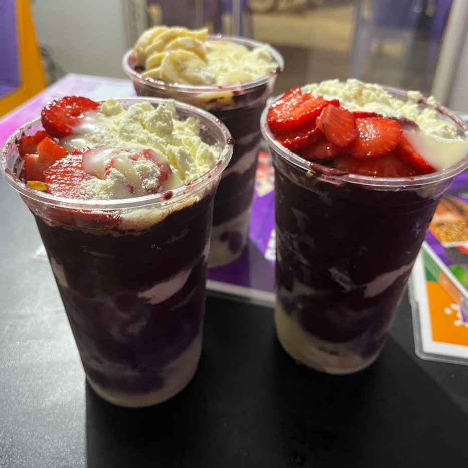 AÇAI, LEITE EM PO, LEITE CONDESADO, GRANOLA, E UMA FRUTA