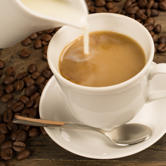 Leite combinado com café passado no coador, que revela sabor intenso e aroma acolhedor.
