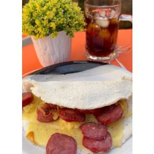 Tapioca recheada com queijo derretido, fatias de calabresa, tomate fresco e toque de orégano.