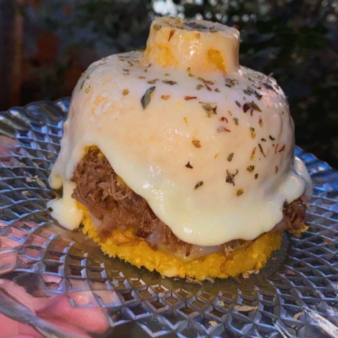 Cuscuz macio recheado com carne de sol saborosa, catupiry cremoso, queijo derretido e tomate fresquinho picado.