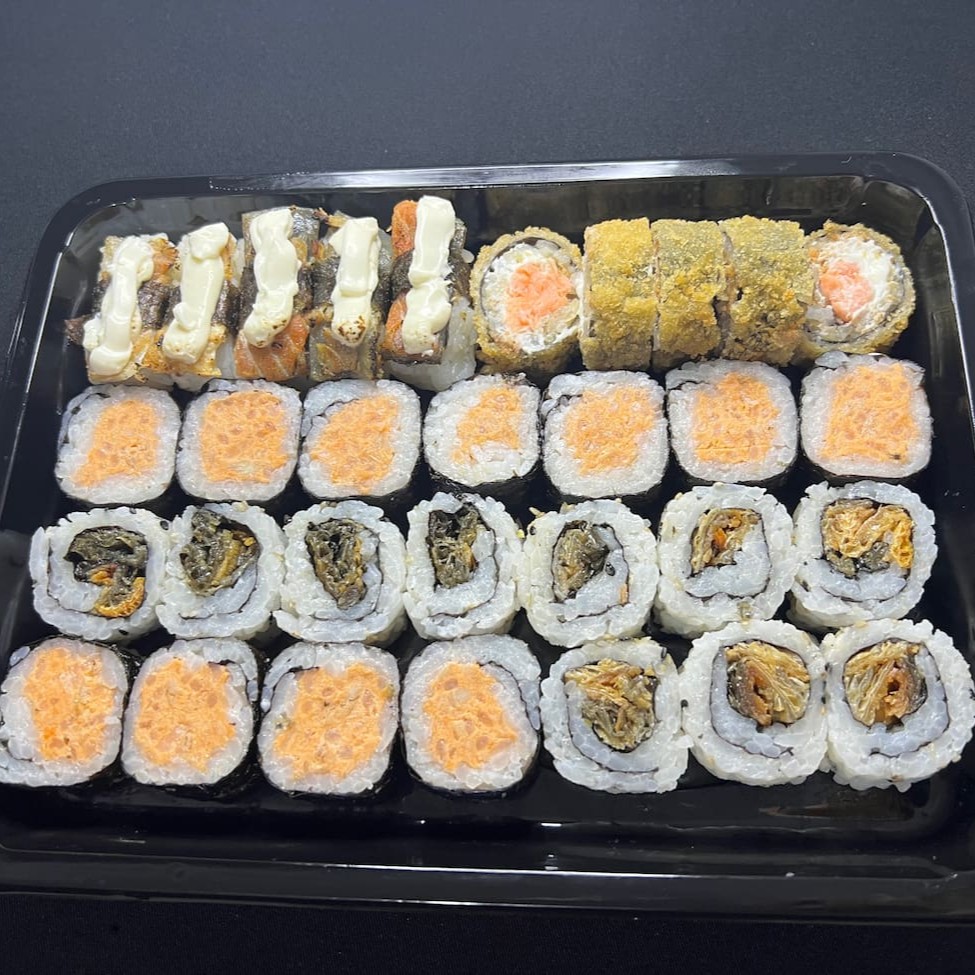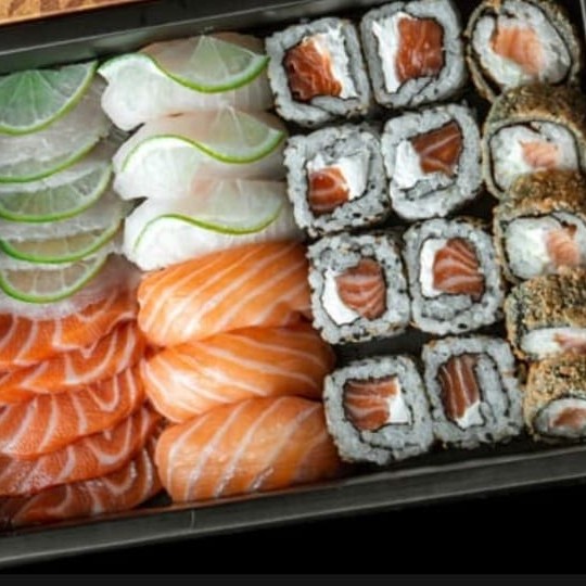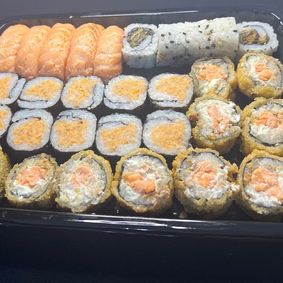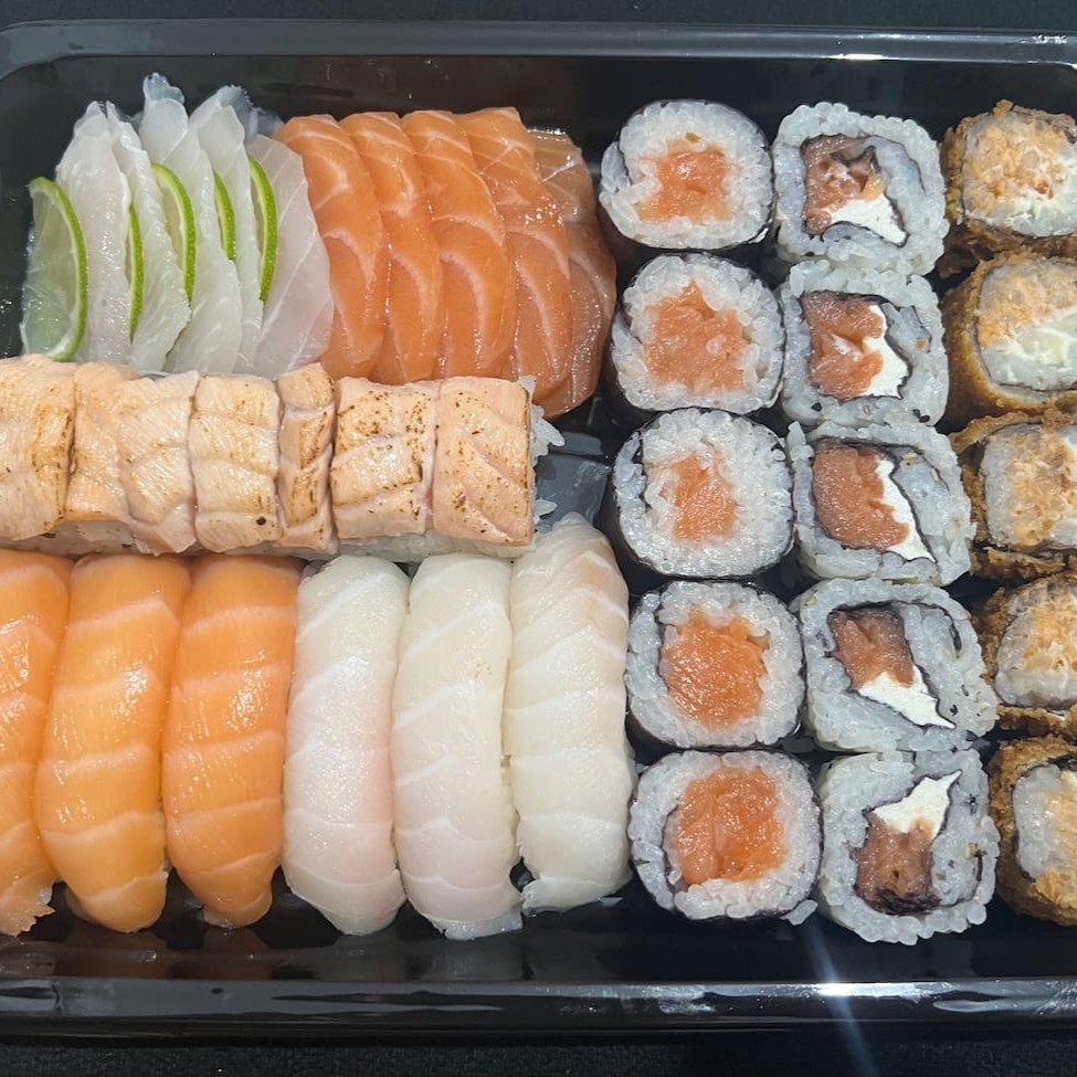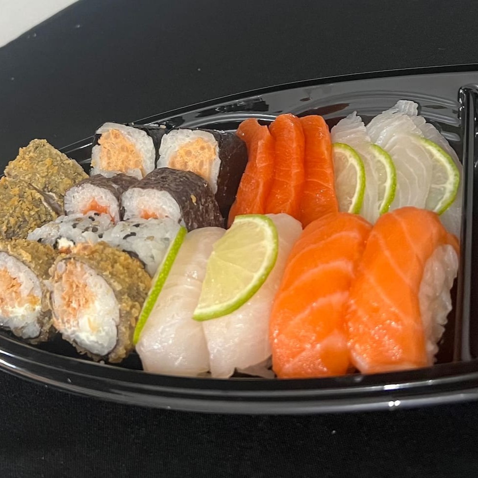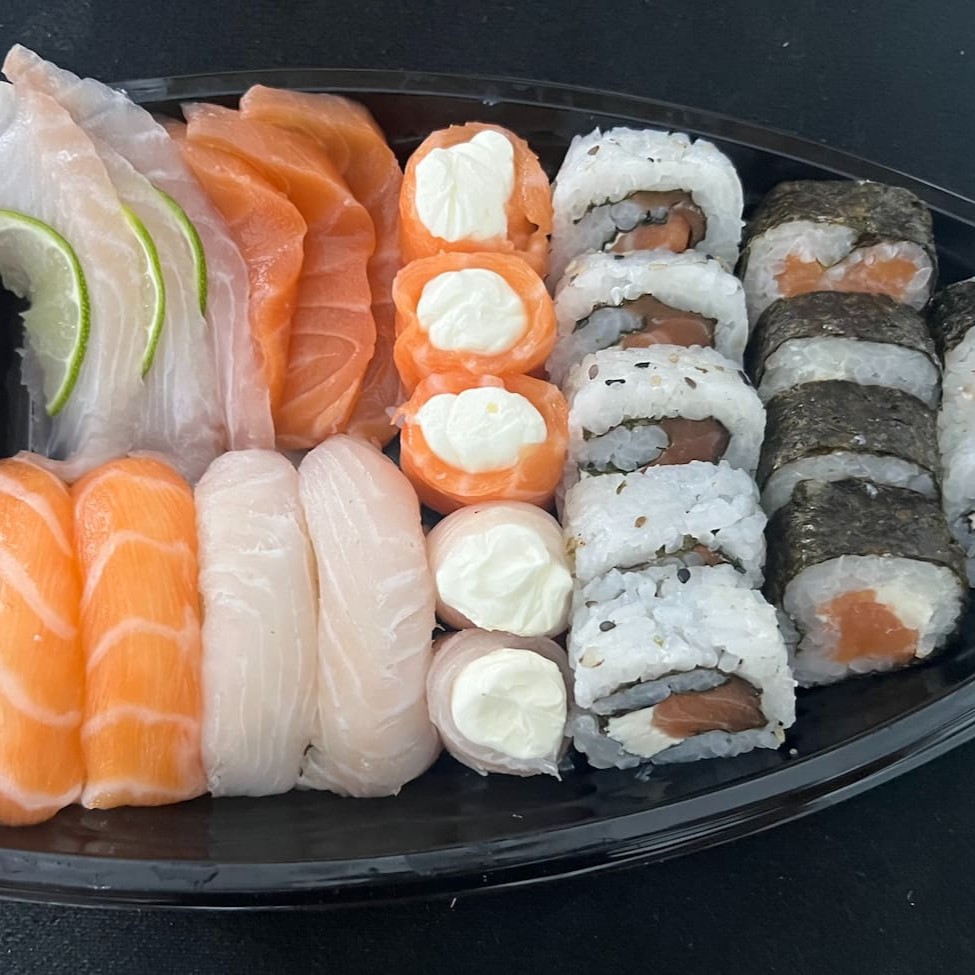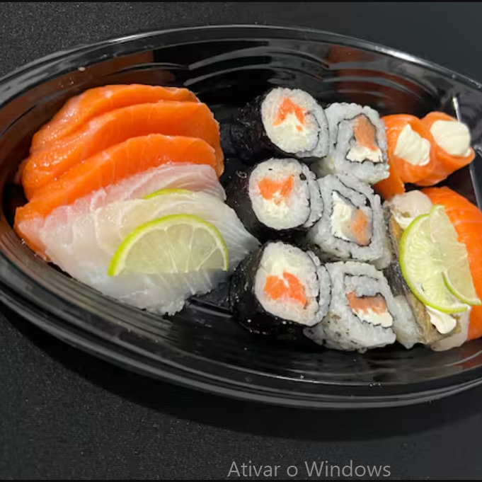 3- sashimis de salmão 2- saint Peter 1- niguiri de salmão 1- niguiri de saint Peter 1- niguiri skin roll 2- gunkan de salmão e cream cheese 5- sushis variados acompanha: 1 kit cortesia sendo 1 sache de shoyo 8ml, 1 sache de tare 8ml, 1 par de hashis, 2 nozuke. Caso queira mais algum itens basta adicionar no carrinho.