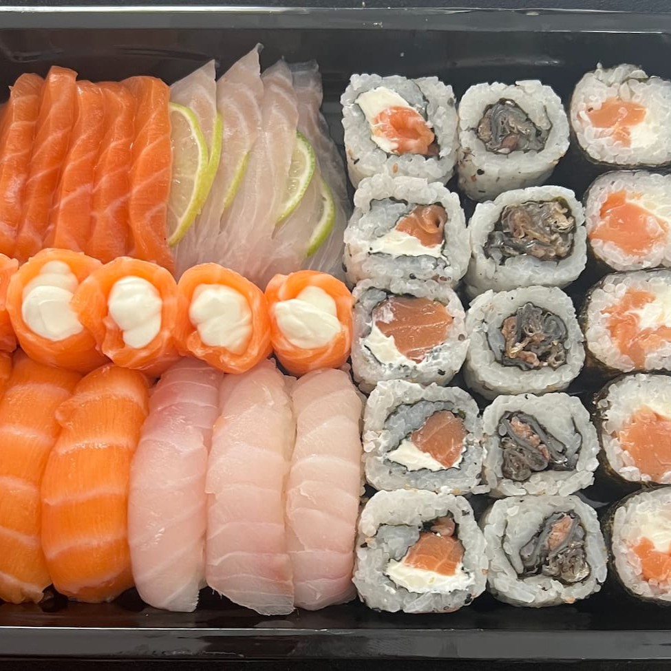 5- sashimi de salmão 4- sashimi de tílapia 5- gunkan cream cheese 3- niguiri de salmão 3- niguiri de tílapia 15- sushis variados Acompanha: 1 kit cortesia. 1 shoyo sache 8ml, 1 tare sache 8ml, 1 par de hashi, 2 nozuke.