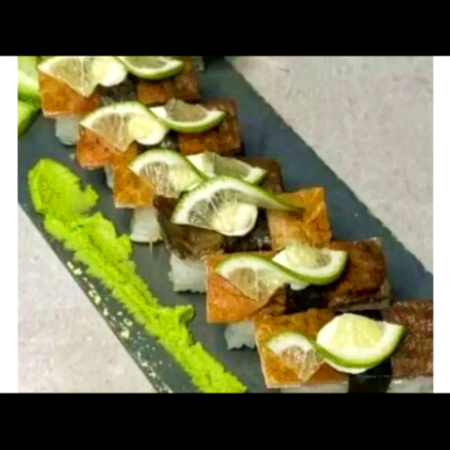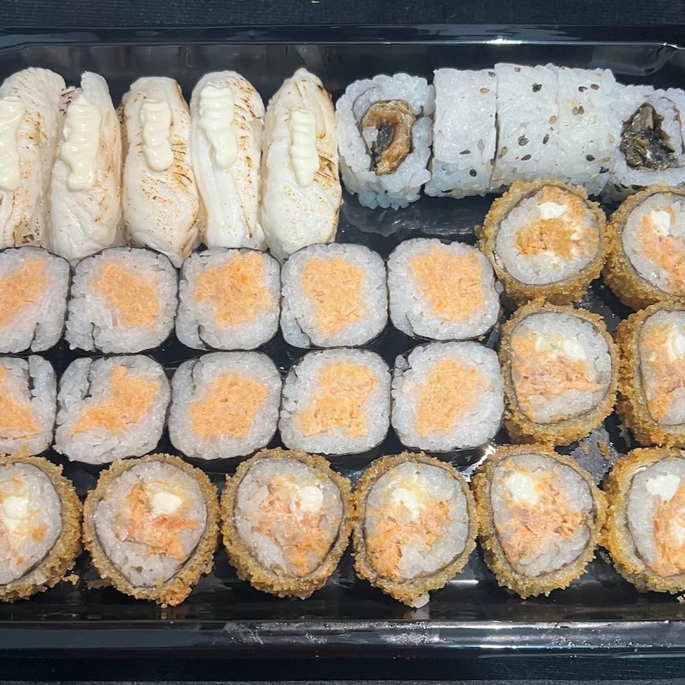 10- de patê de salmão grelhado 10- hot Philadelphia 5- uramaki skin 5- niguiri de saint peter selado Acompanha um kit cortesia. 1 shoyu sachê, 1 tare sachê, 1 par de hashi e 2 nozuke