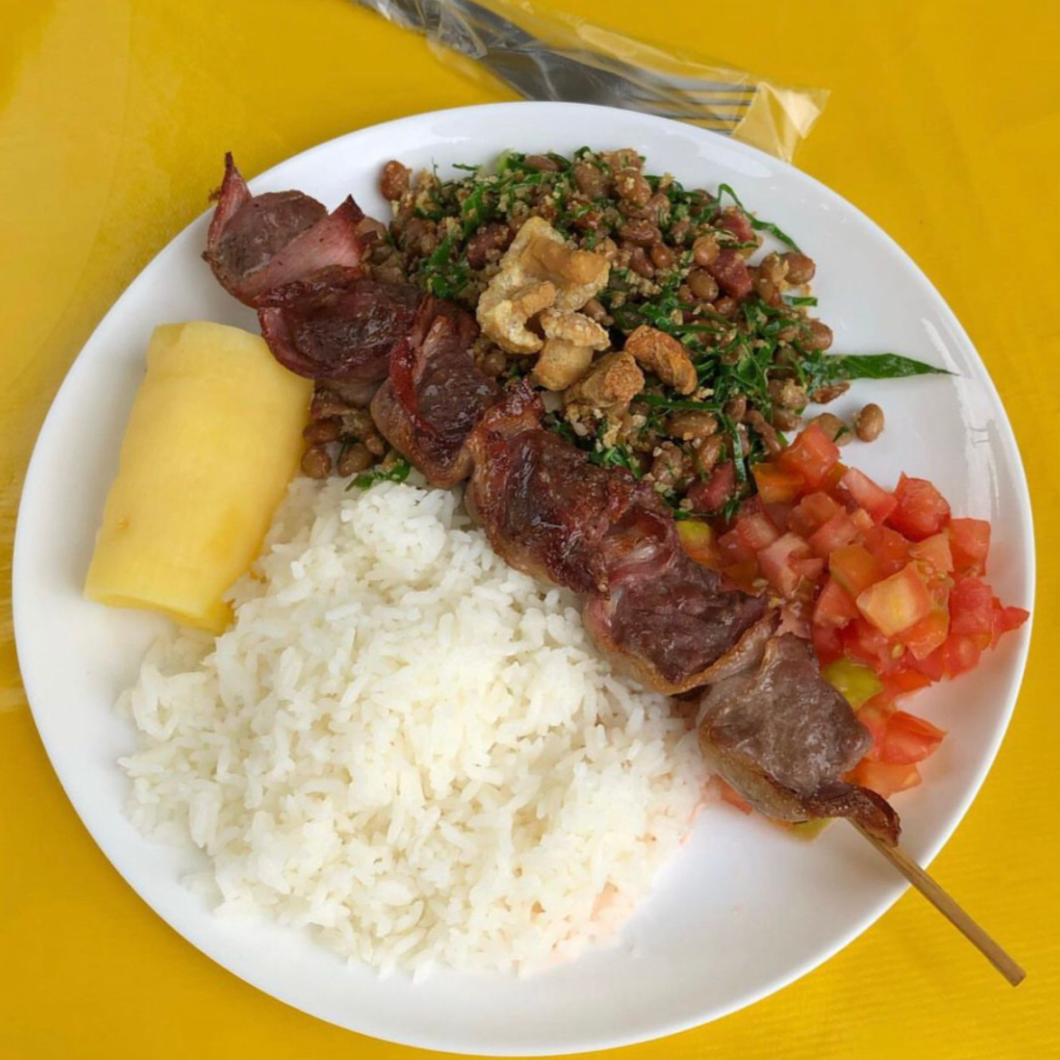 arroz , feijao tropeiro, mandioca, vinagrete um espeto macio uma fanta lata