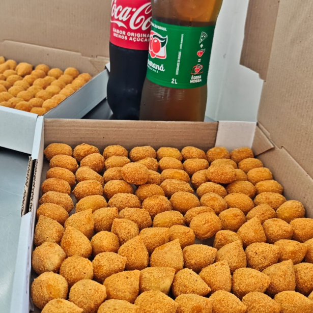Combo de 200 salgados, podendo escolher até 7 sabores com 25 unidades cada. + 1 Guaraná 2L + 1 Coca 2L
