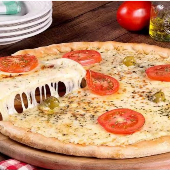 Molho de pizza , mussarela,provolone,tomate,azeitona e orégano.
