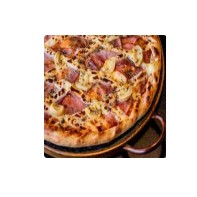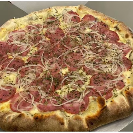 Molho de pizza ,mussarela,presunto,lombo,bacon,cebola,e oregano.
