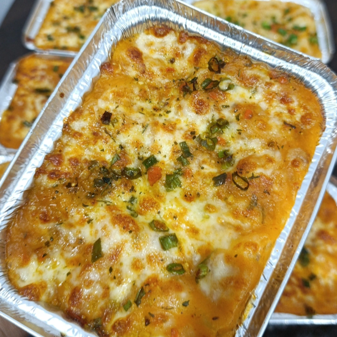 Uma lasanha preparada com muito sabor , frango cozido no molho vermelho com batata trazendo aquele sabor da casa de mãe , com uma camada de molho de batata inglesa e mussarela pra dar aquele toque especial