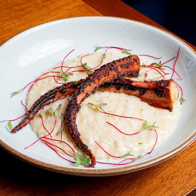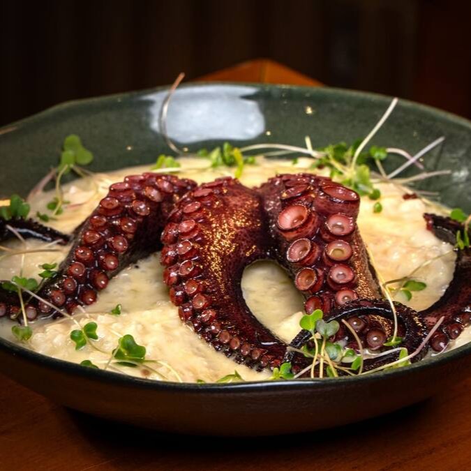 Tentáculos de polvo acompanhado de risotto de limão siciliano.