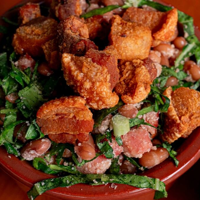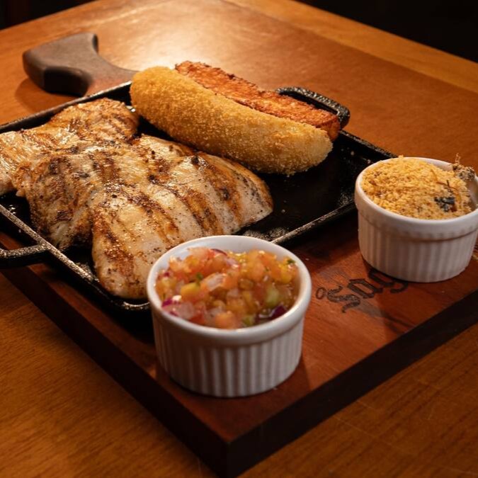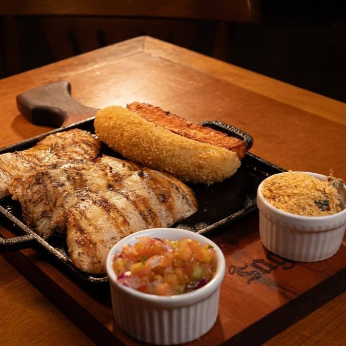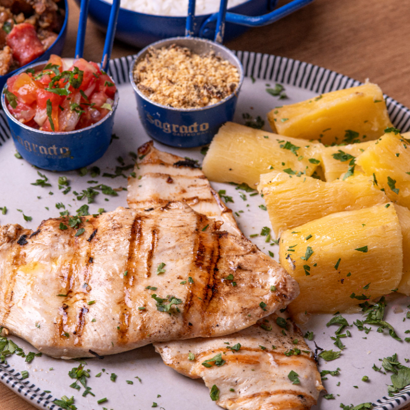 Filé de frango grelhado na brasa, servida com arroz branco soltinho, feijão tropeiro, mandioca na manteiga, farofinha caseira e vinagrete fresco.