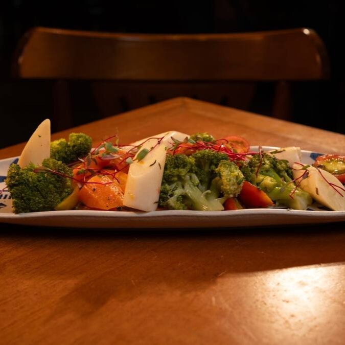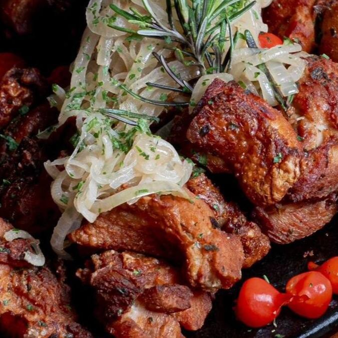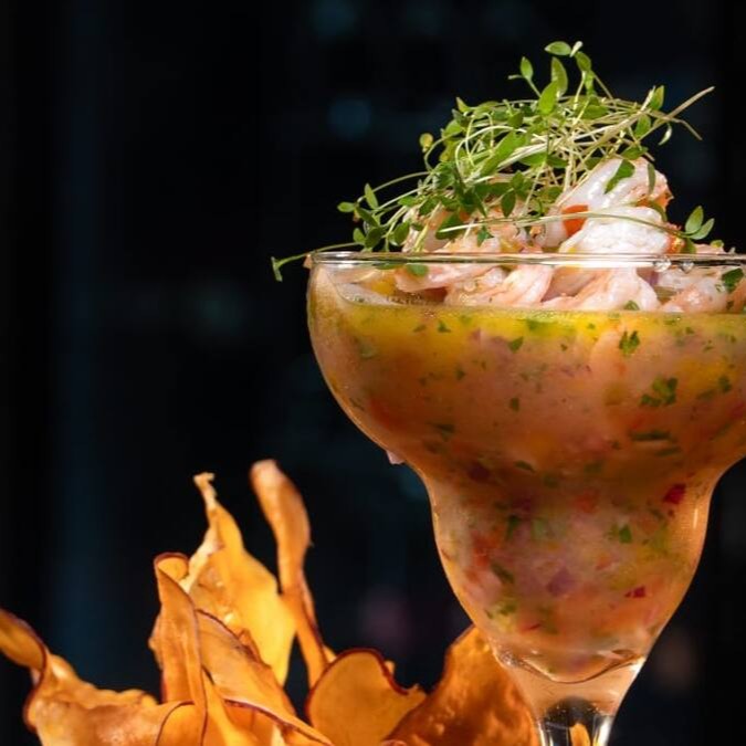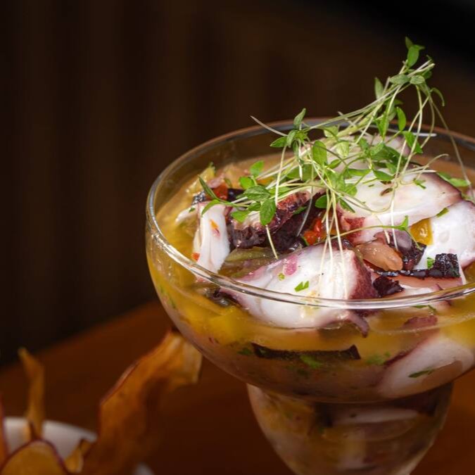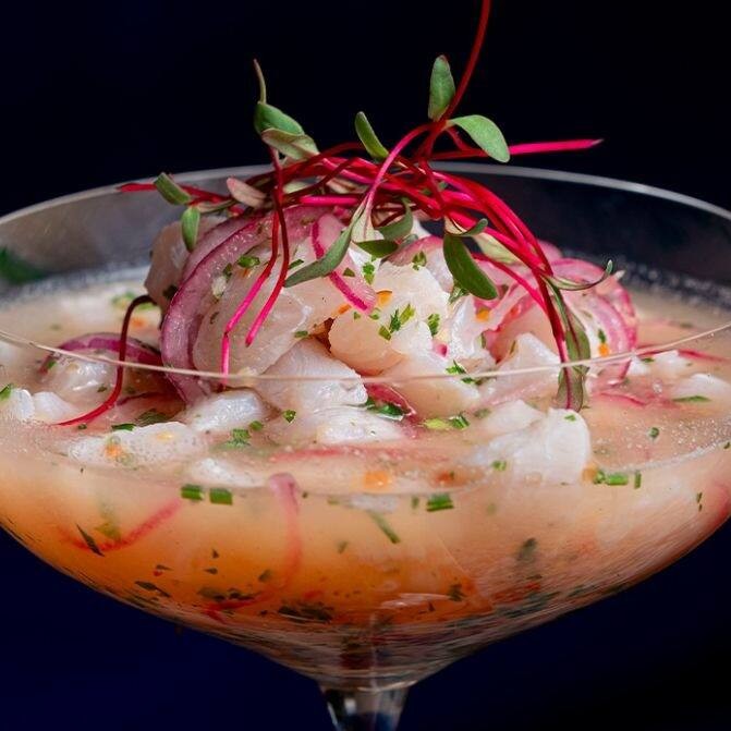 Filé de tilápia, cebola roxa, pimenta dedo de moça, gengibre, ervas fresca, caldo de laranja e limão servido com mandioca chips ou torrada.