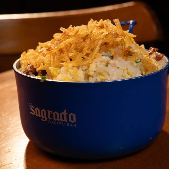 Arroz branco, ovos, bacon, salsinha e batata palha.