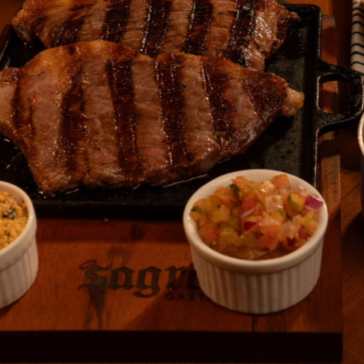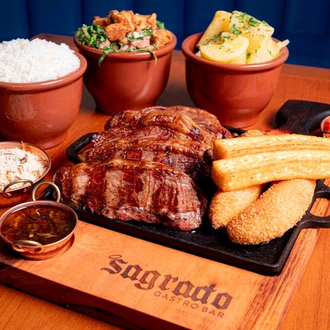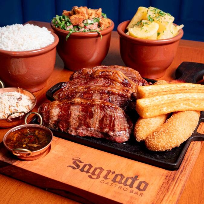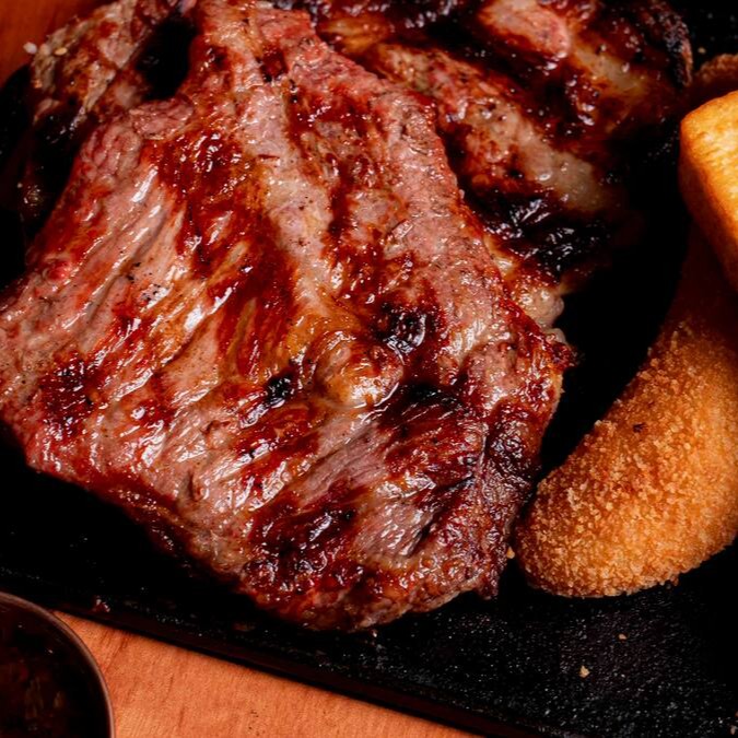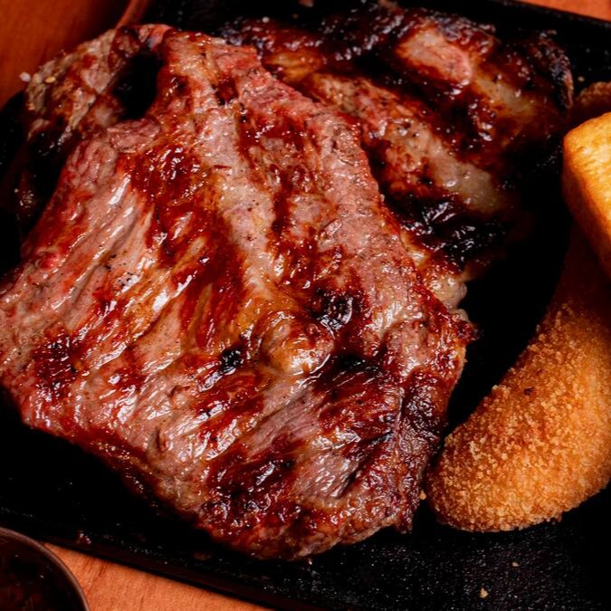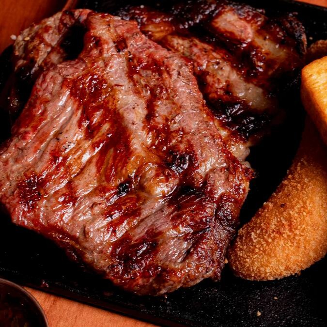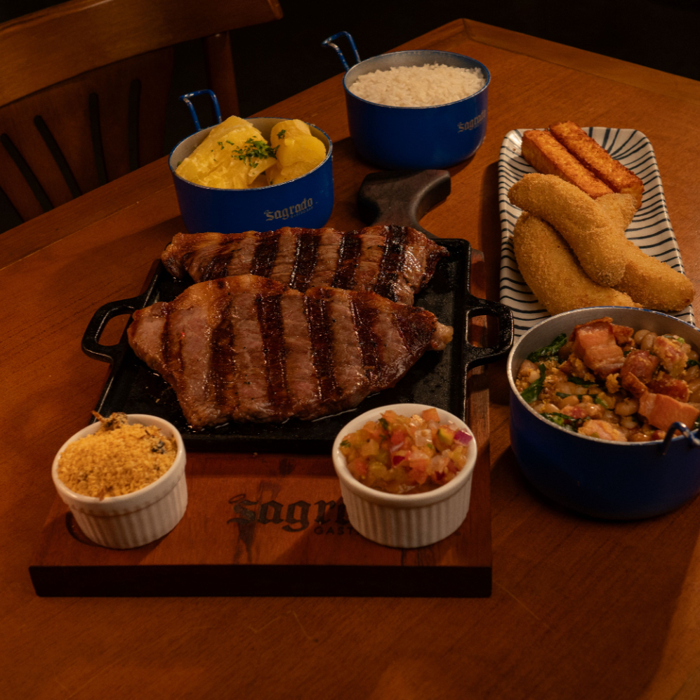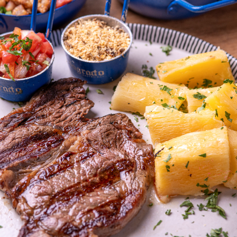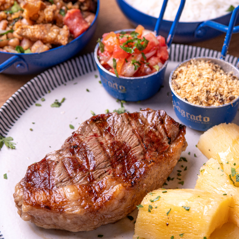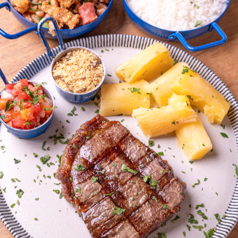 Bife ancho grelhado, servido com arroz branco soltinho, feijão tropeiro, mandioca na manteiga, farofinha caseira e vinagrete fresco.