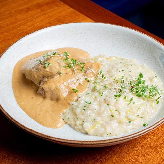 Risoto de alho poró acompanhado de escalope de filé mignon ao molho de mix de mostarda.