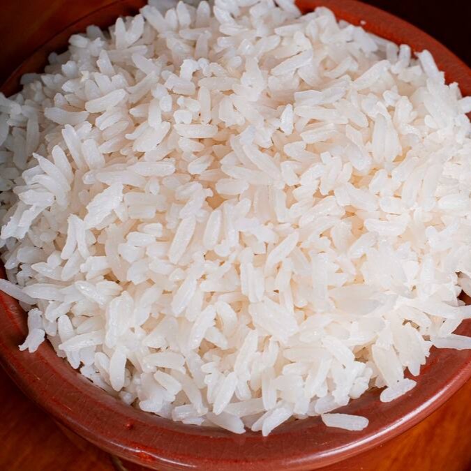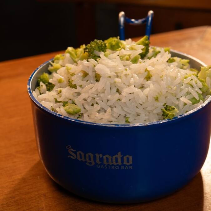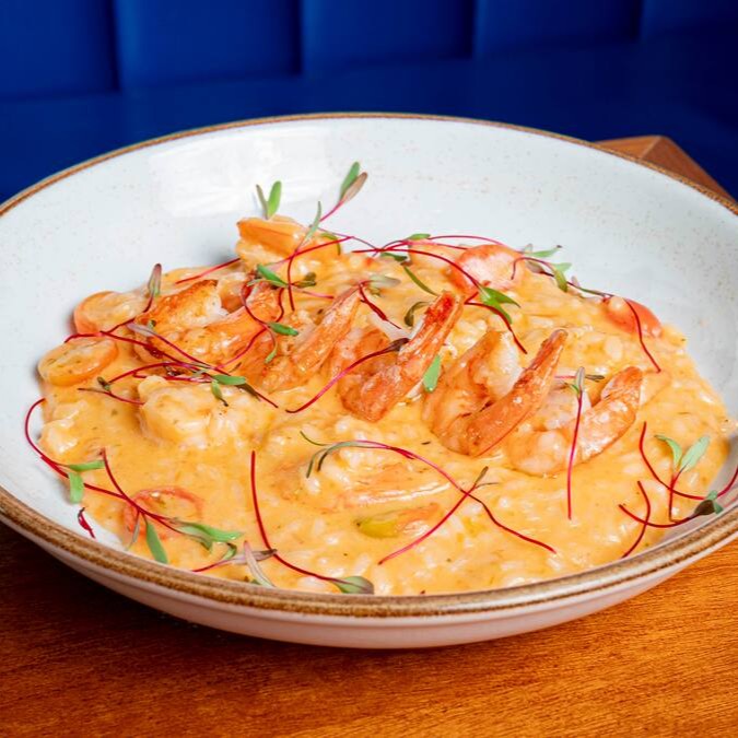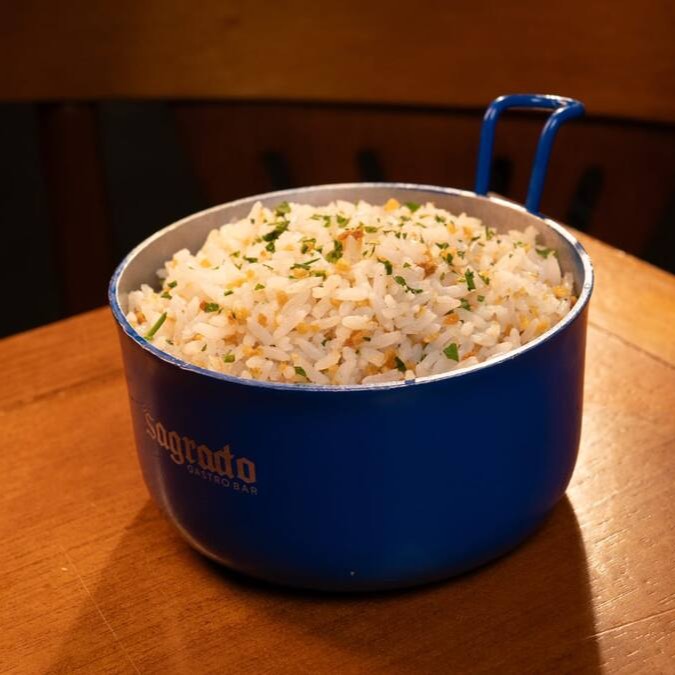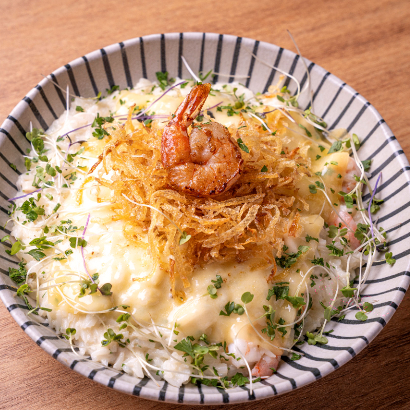 Camarões preparados com arroz branco, presunto, ervilha, palmito, champignon, leite de coco e queijo muçarela, finalizado com batata palha caseira.