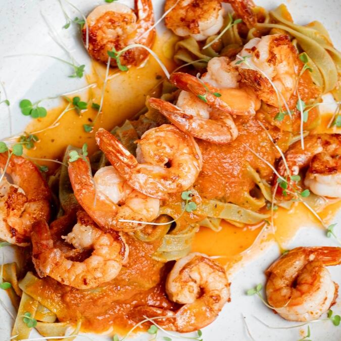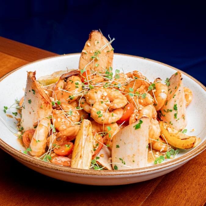 Camarão rosa G, palmito, alho, azeite e tomate cereja