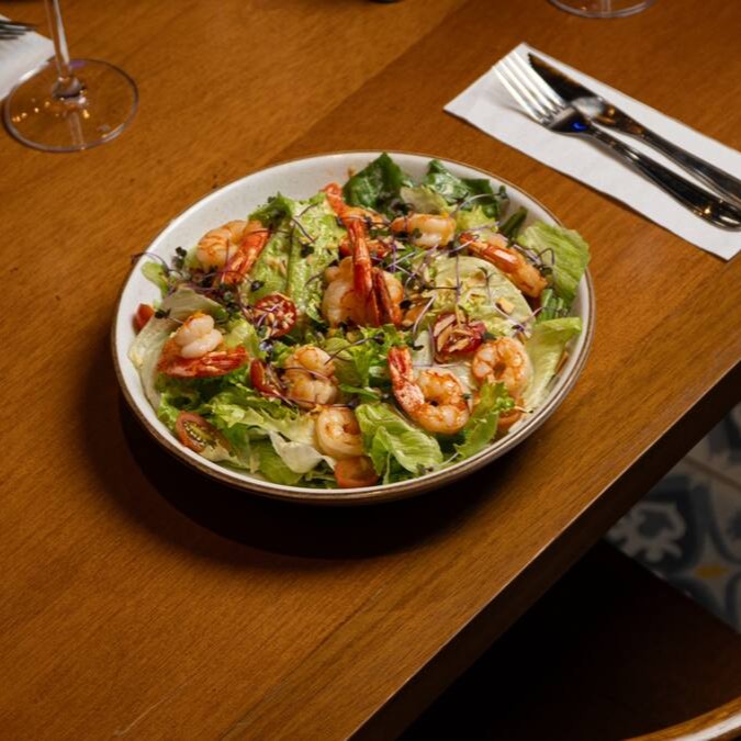 Mix de folhas, tomate cereja, castanhas molho do chefe e camarões G grelhados.