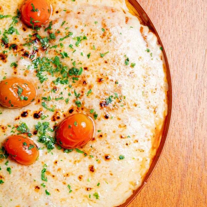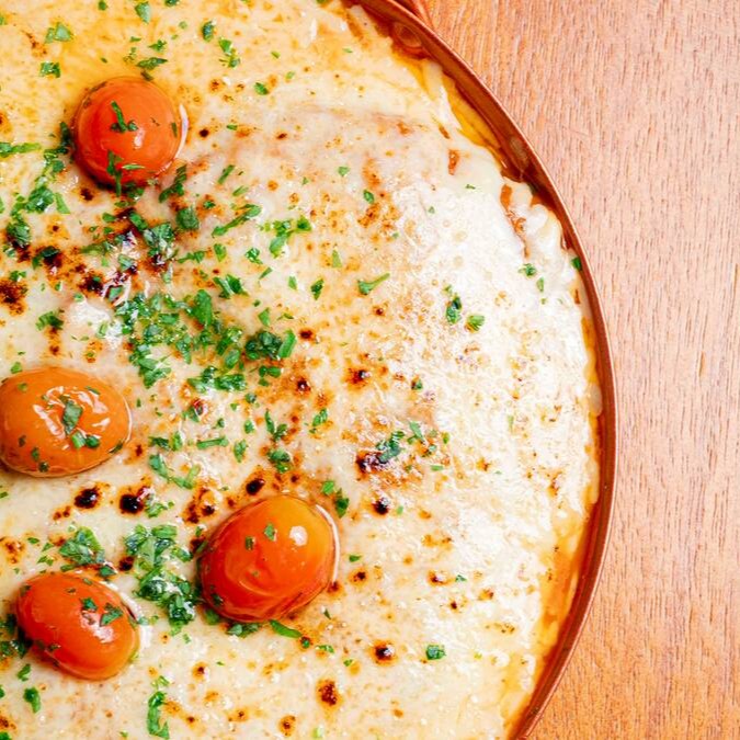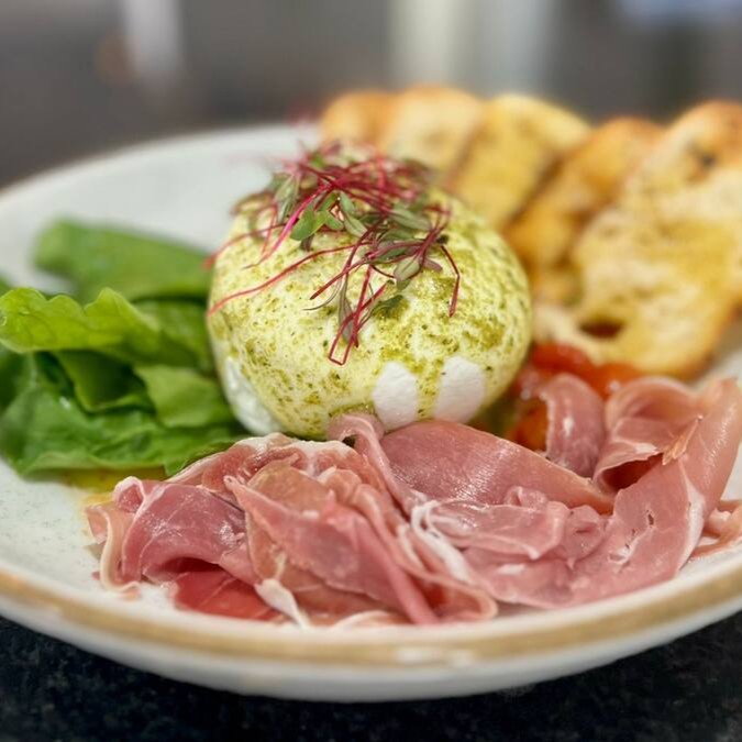 Burrata 180g, molho pesto, parma, tomates confit, rúcula e torradas da casa.