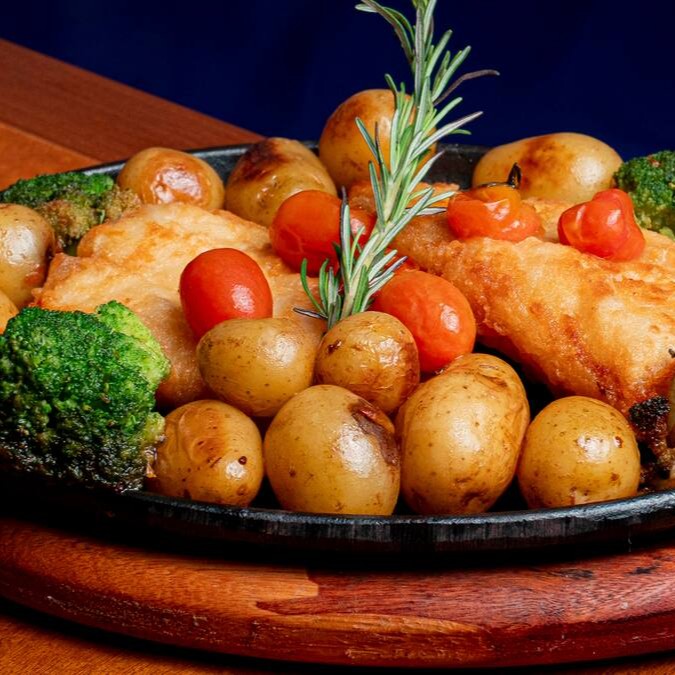File de tilápia a milanesa coberto com molho vermelho natural, mussarela gratinada acompanha arroz com brócolis e fritas.