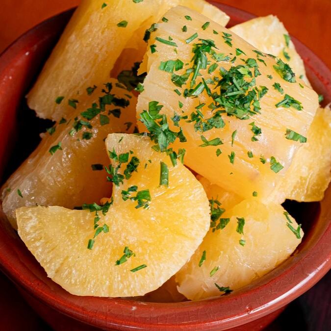 Mandioca cozida finalizada com manteiga do sertão e alho frito
