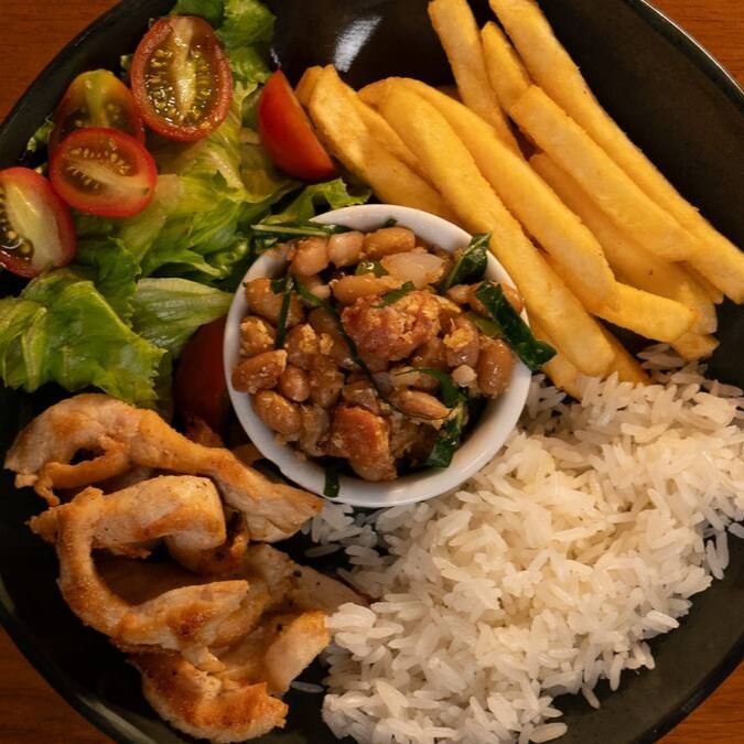 Filé de frango grelhado, arroz, feijão tropeiro, saladinha e fritas. (Porção Kids)
