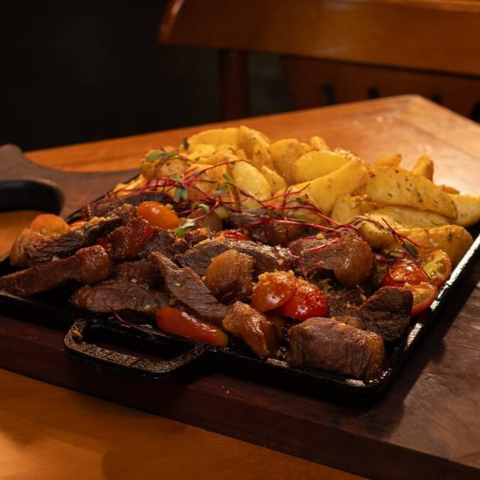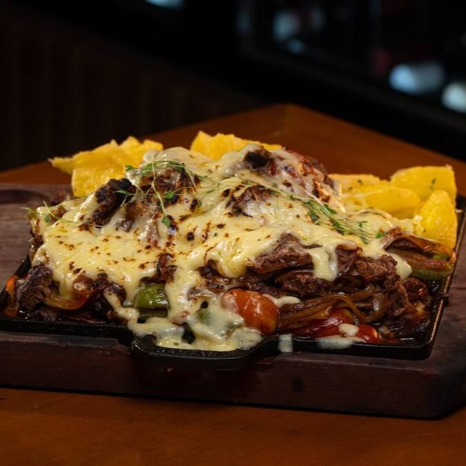 Tiras de file mignon , tomate cereja , cebola , mix de pimentão , mussarela e mandioca