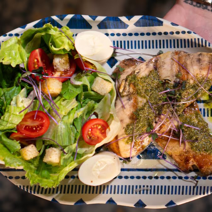 Alface americana, molho Ceaser, tomate cereja, frango grelhado e parmesão ralado.