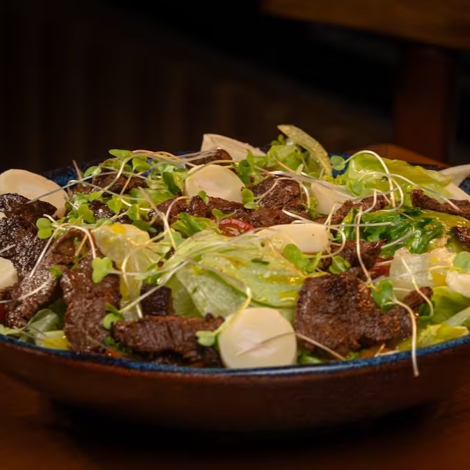 Mix de folhas , palmito , tomate cereja , parmesao ralado , tiras de file mignon , molho de mostarda e mel .