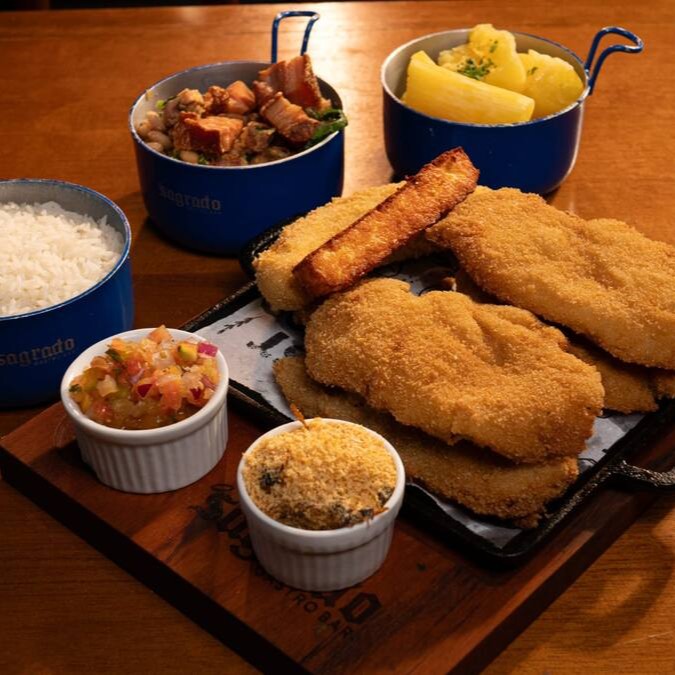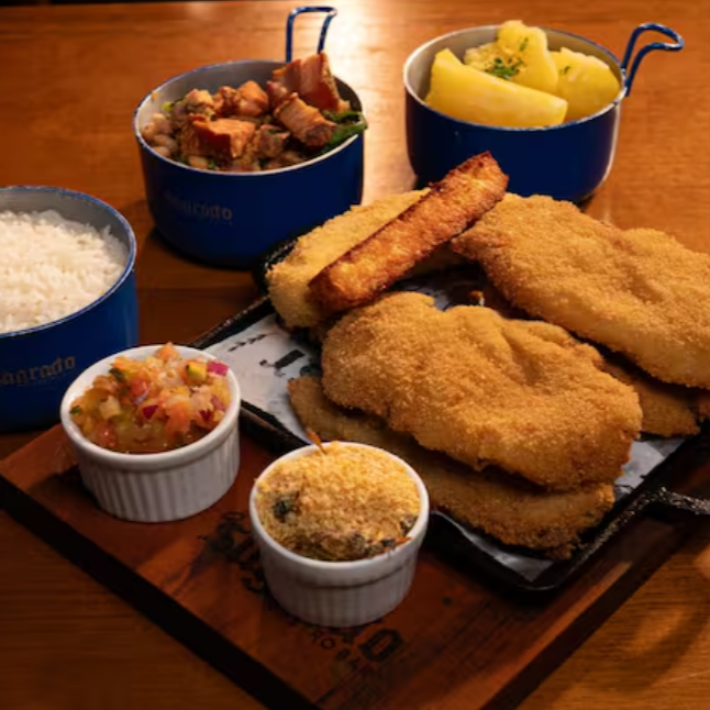 File de frango a milanesa acompanhado de feijão tropeiro, mandioca cozida, arroz branco, banana a milanesa, queijo coalho, farofa e vinagrete.