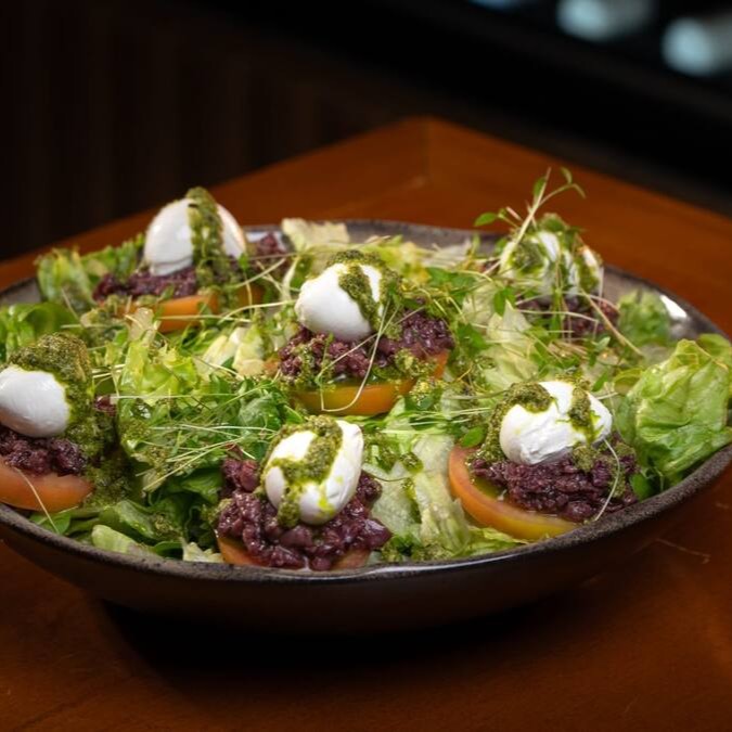 Mix de folhas , mussarela de bufala , pesto , azeitona preta e tomate cereja .