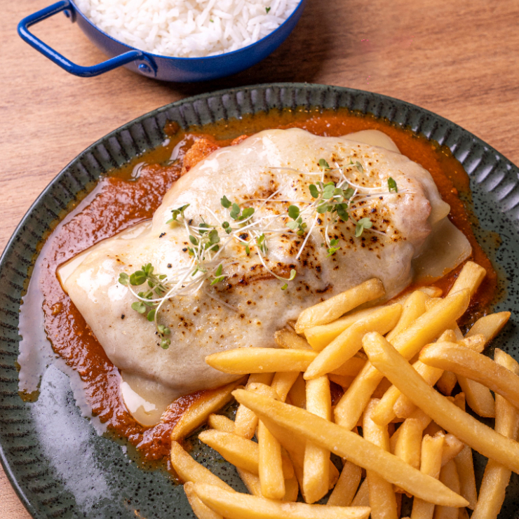 Filé de frango empanado, coberto com molho de tomate caseiro com manjericão, finalizado com queijo parmesão e muçarela derretida. Acompanhado de arroz branco soltinho e batata frita crocante.