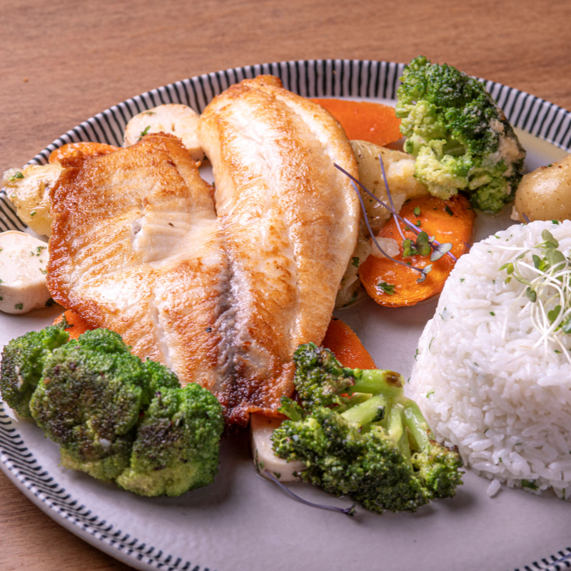 Filé de tilápia grelhada, servida com legumes salteados e arroz no leite de coco.