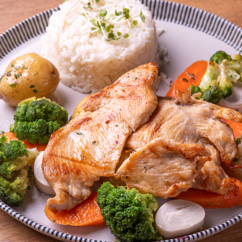 Filé de frango grelhado, servida com legumes salteados e arroz no leite de coco.