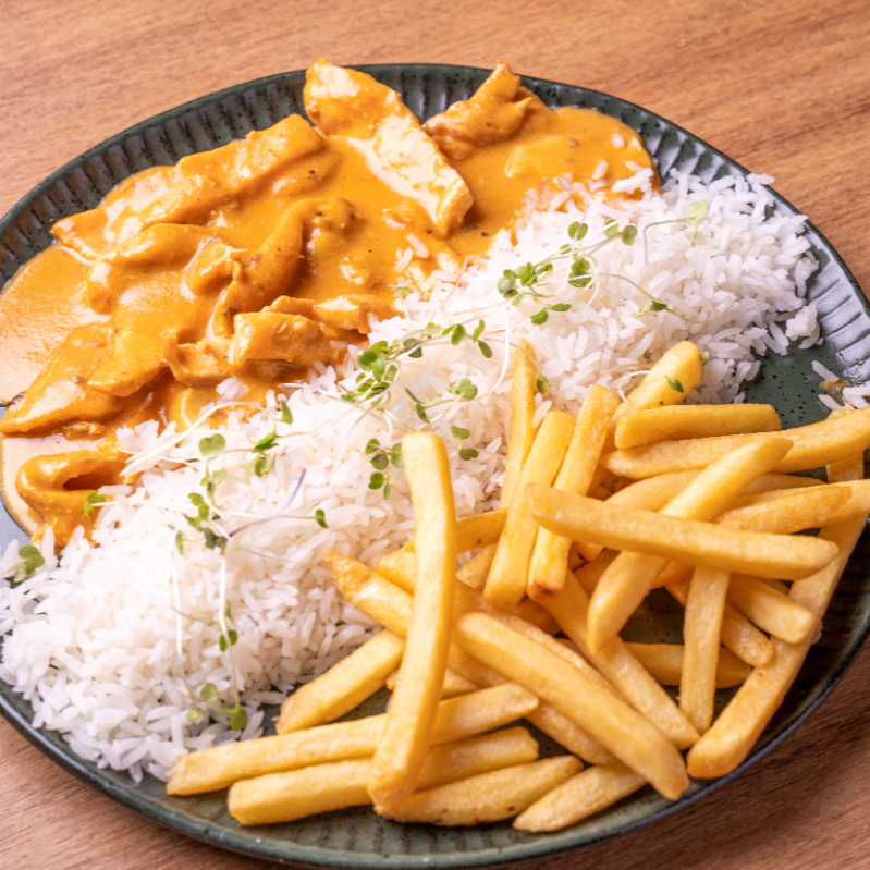 Strogonoff de frango com champignon, servido com arroz branco soltinho e batata frita.