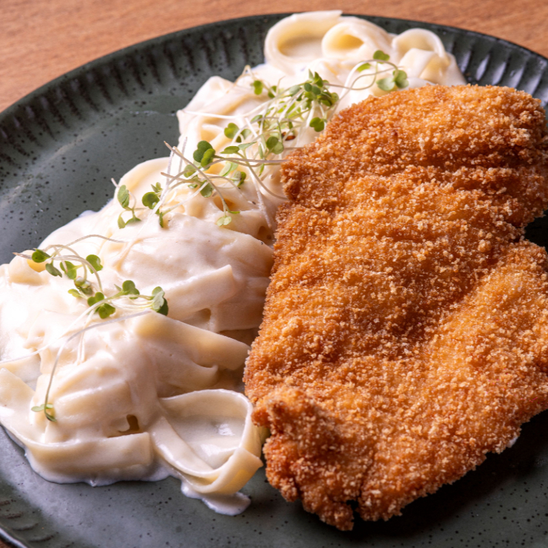 Filé de frango empanado, servido com fettuccine ao molho Alfredo.