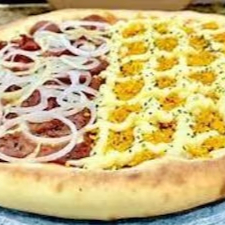 Meio 4 Queijos: Massa artesanal, molho de tomate, muçarela, parmesão, gorgonzola, Catupiry, orégano. Meio Calabresa: Massa artesanal, molho de Tomate, muçarela, calabresa, cebola, orégano.