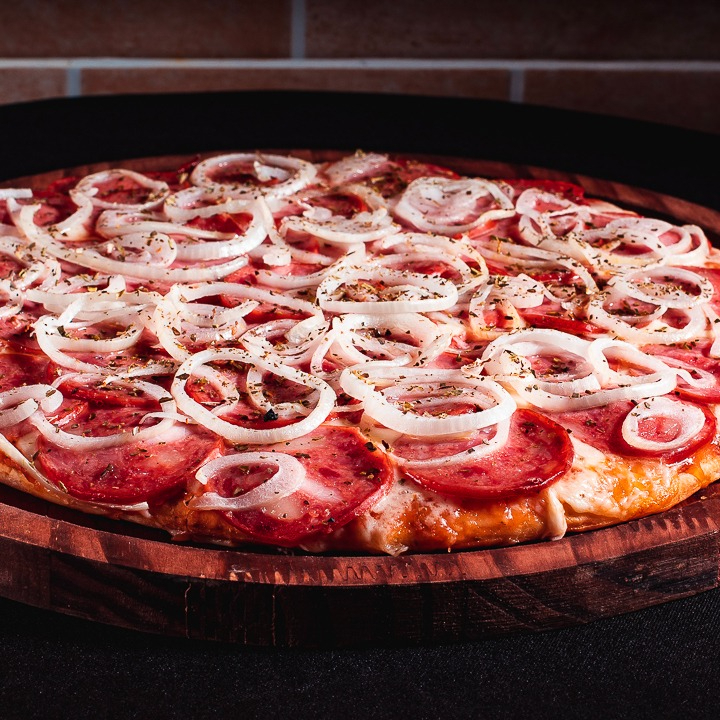 Massa artesanal, molho de tomate, muçarela, calabresa, cebola, oregano.