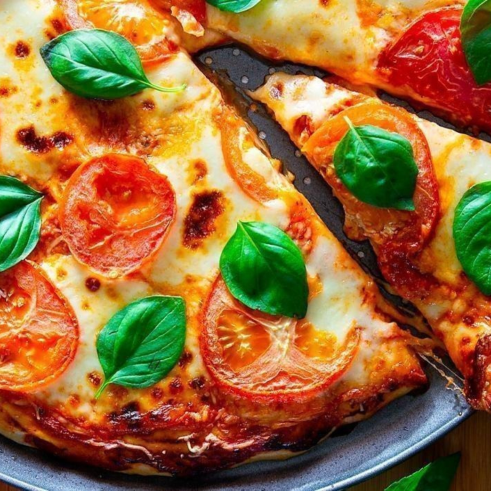 Massa artesanal, molho de tomate, muçarela, tomate, manjericão, oregano.